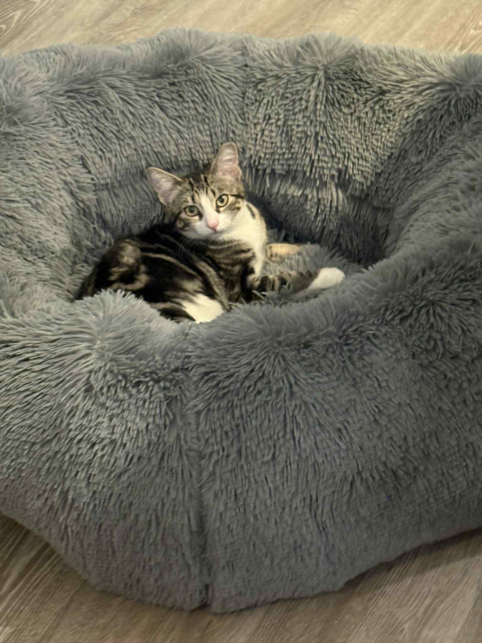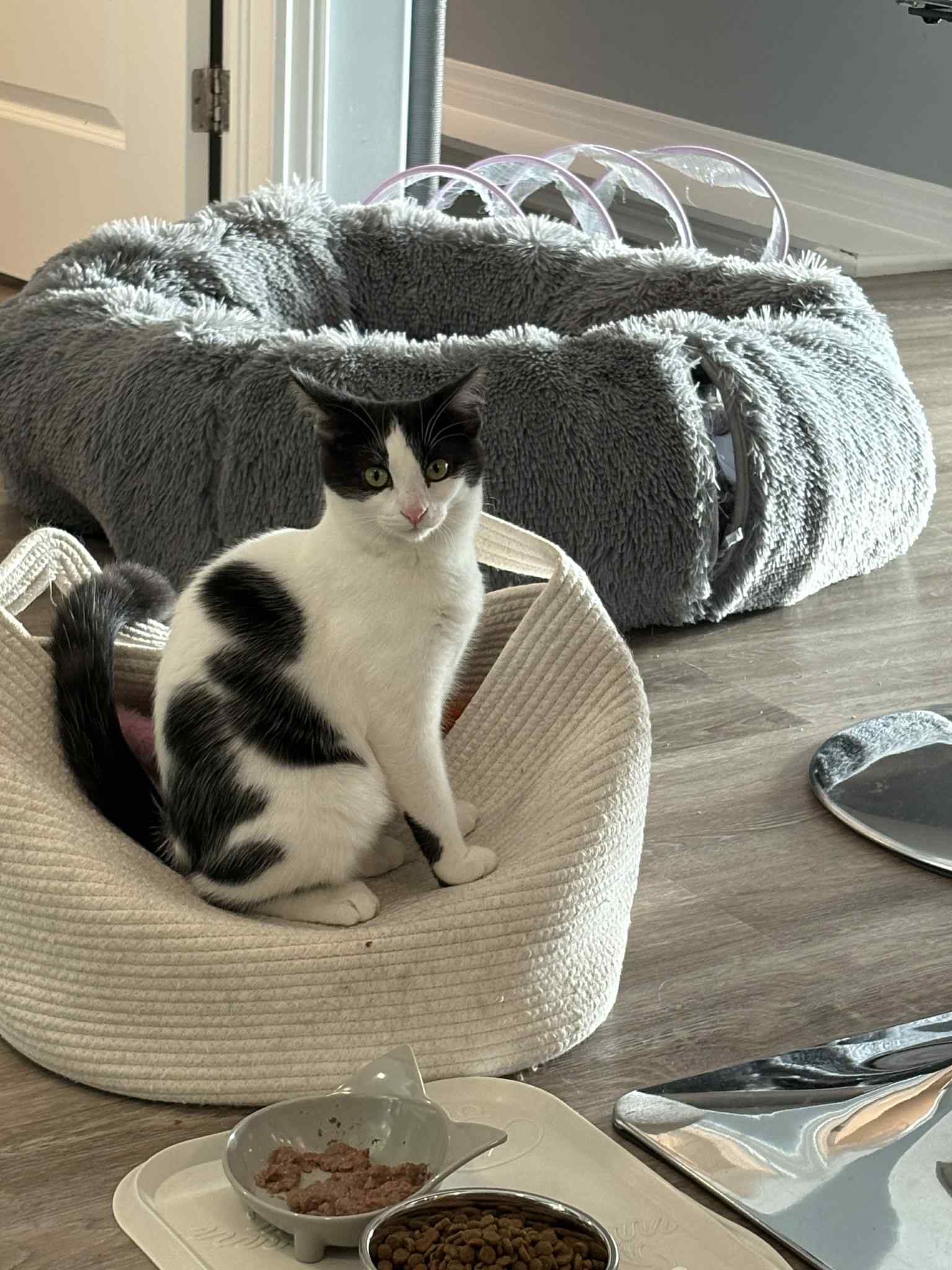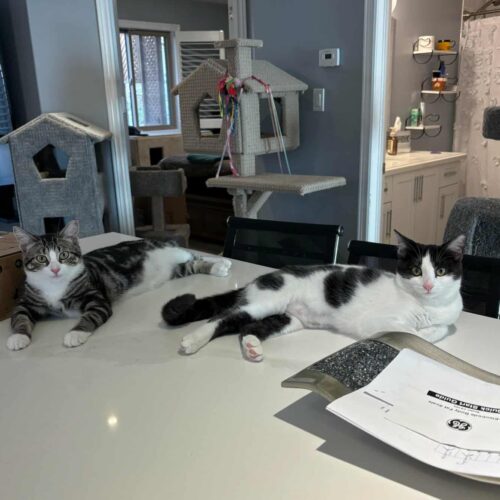 Meet Sushi (black & white) and Tula (tabby) – our lovely velvety coated sisters. Born outside and semi-feral, these girls are now loving the comforts of the indoors and the attention of their humans. Although they will initially be shy, once settled you will be delighted by their playful and loving natures. Tula readily comes to her foster mom when called by name while Sushi likes to give a little hiss before purring up a storm for pets. The girls have been integrated into their foster home and do well with the resident cats. They enjoy wands, spring toys, balls, cat trees and window watching. They are about six months old and have always been together. They deserve to stay that way. Tula and Sushi are better suited to older children and adults. They are untested with dogs.