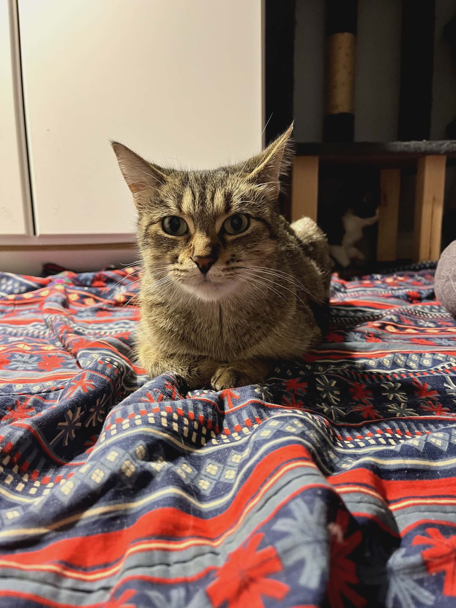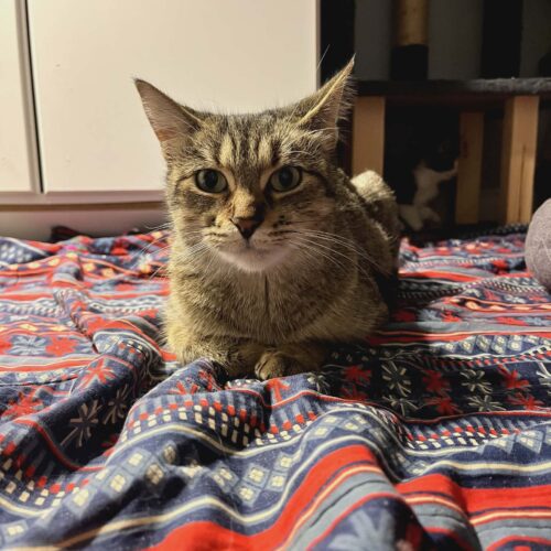 Meet Autumn! Autumn is one of our momma cats and a beautiful tabby about 3.5 years old. She is a gentle soul rescued from a backyard with her four kittens. She follows her foster mom around, head butts and loves to be pet. She is very treat motivated! Autumn prefers to sit in a lap over being picked up and will bat around catnip toys or play fight with one of her kittens. She is not keen on the larger dog in her foster home but has accepted him as long as he does not startle her – LOL! Autumn is good with the young children in her foster home but would enjoy a mature home as well.