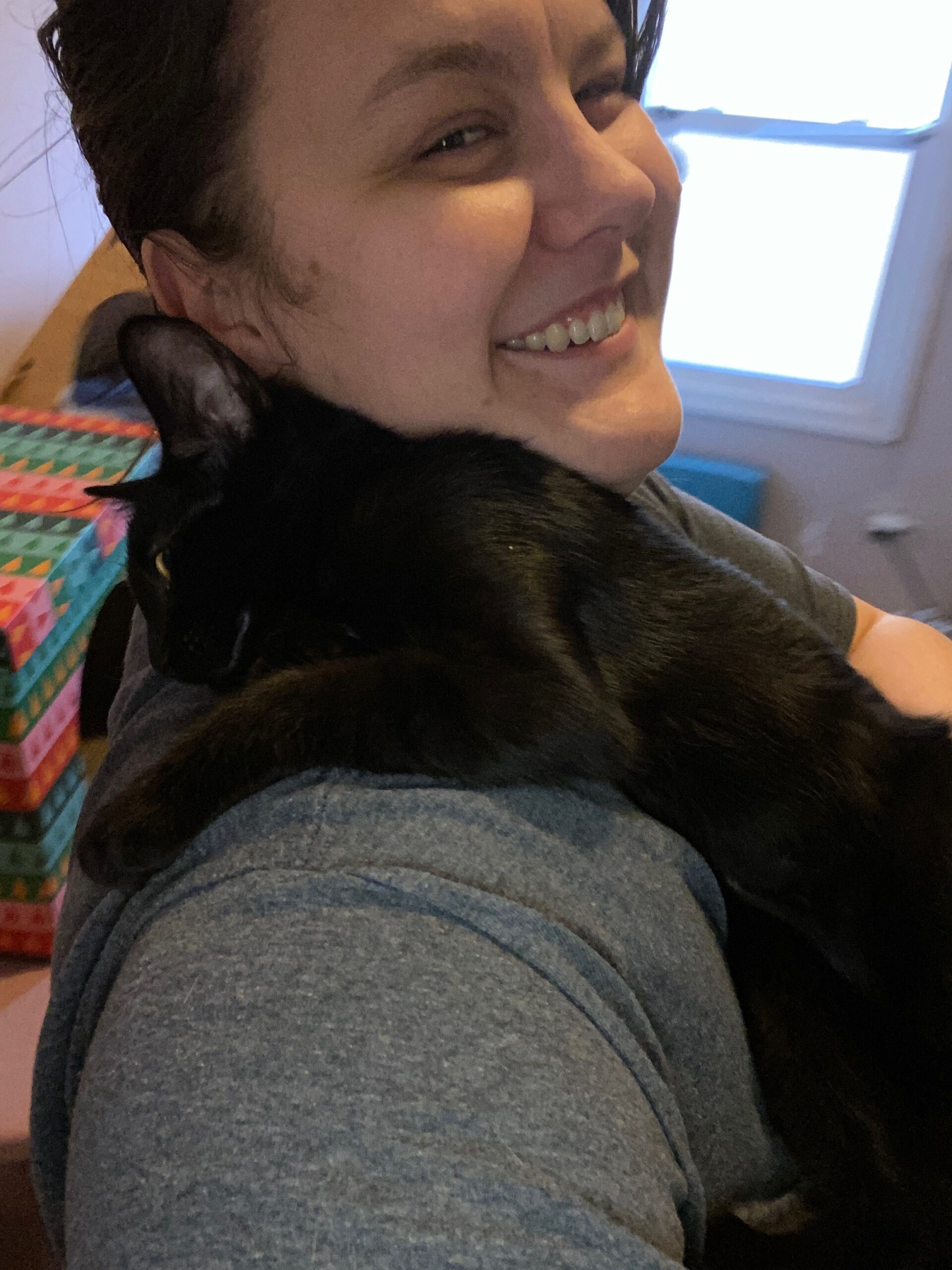 I adore being close to my people and have a special talent for climbing right up onto your shoulder to snuggle next to your face, purring like a perfectly tuned stadium crowd. If you’re sitting or lying down, chances are I’ll be tucked beside you, pressed close, offering nose kisses and soaking up every bit of love. I’m a champion cuddler who believes naps are best taken with a human teammate.