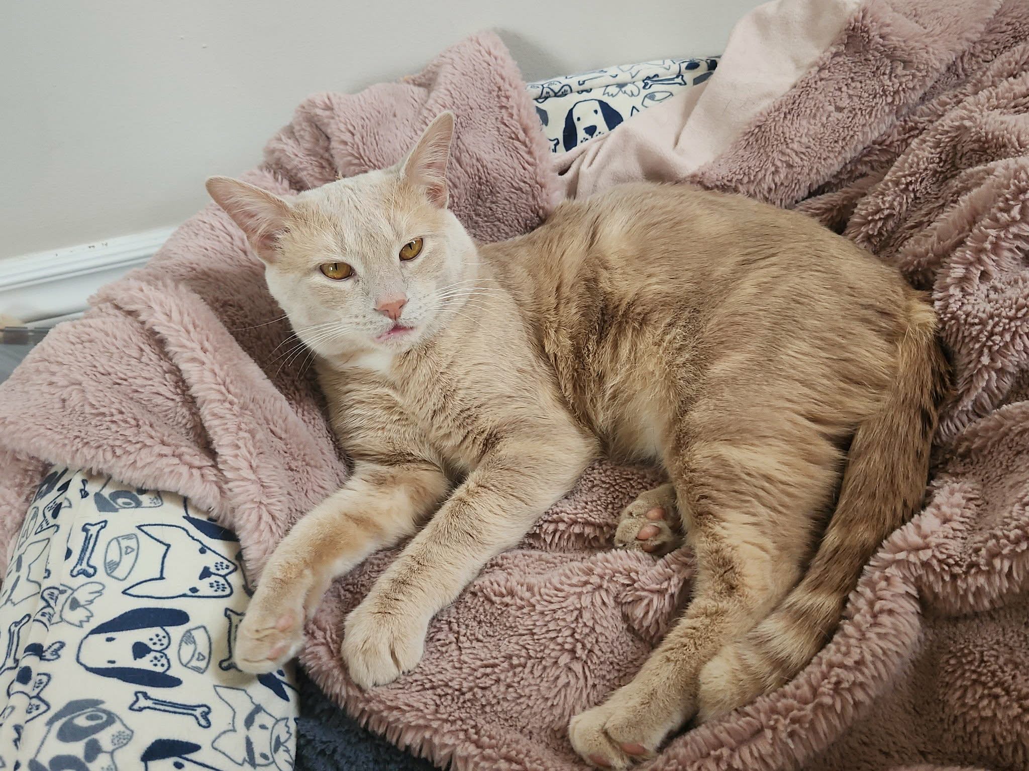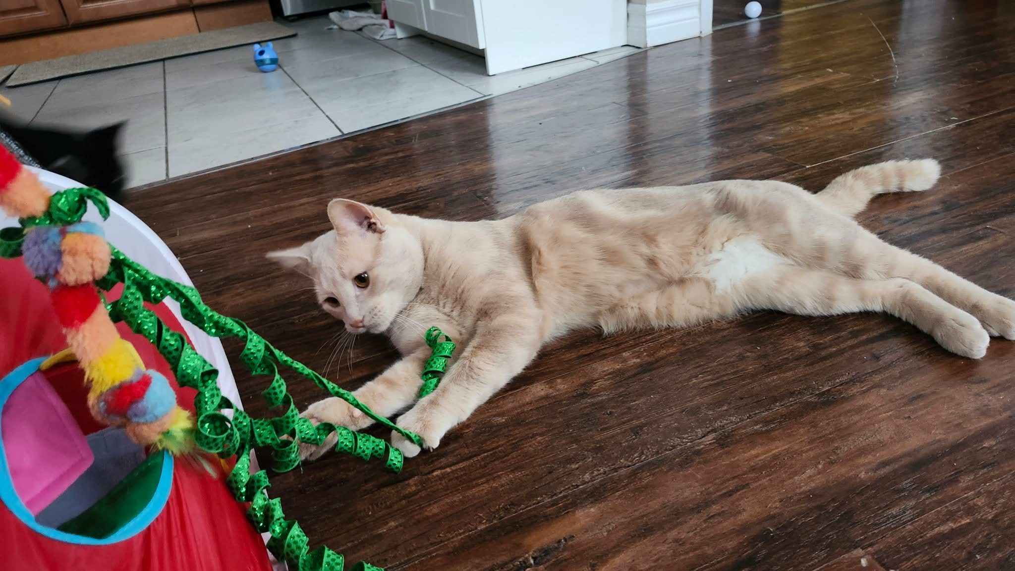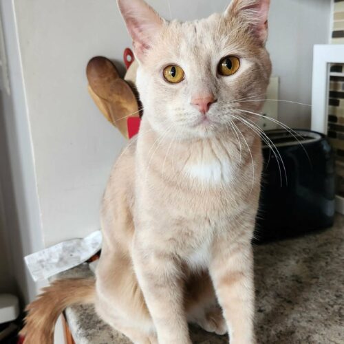 Meet Hartley! Hartley is a sweet & gentle buff tabby. He likes to be pet and snuggles with his foster mom at bed time. Hartley loves his cat toys and needs to be with another gentle cat. He is good with the child in his foster home. Hartley will be shy at first and will likely hide for the first few days. Even when he hid for the first few days at his foster home, he allowed pets and was always gentle. Hartley makes cute cat noises. He likes to have places to jump up on - he sometimes hangs out on top of the fridge or on top of the kitchen cabinets. He would probably enjoy having a cat tree.