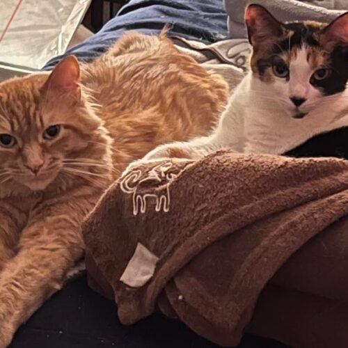 Meet Cleo (Female, Calico) & her bonded brother Petra (Male, Orange Tabby)! These beautiful gentle cats are just under 5 years old. Cleo and Petra were unfortunately returned to us due to a divorce. They are very sweet cats. Petra is very affectionate and Cleo likes her pets too. Their foster mom says they particularly love their playtime in the morning! Petra & Cleo are used to a more mature home and have done well with grandchildren visits. They did live with dogs and other cats in the past and did just fine.