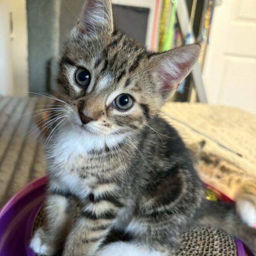 Meet Sammy! Sammy is a very handsome male tabby kitten born Oct 24th. He is a sweet, playful & happy kitten who loves to run and play. He needs to go to a home with another young playful cat that he can bond with. Sammy is good with other cats but unproven with dogs. As he is so young, he should adapt quickly to a canine friend.
